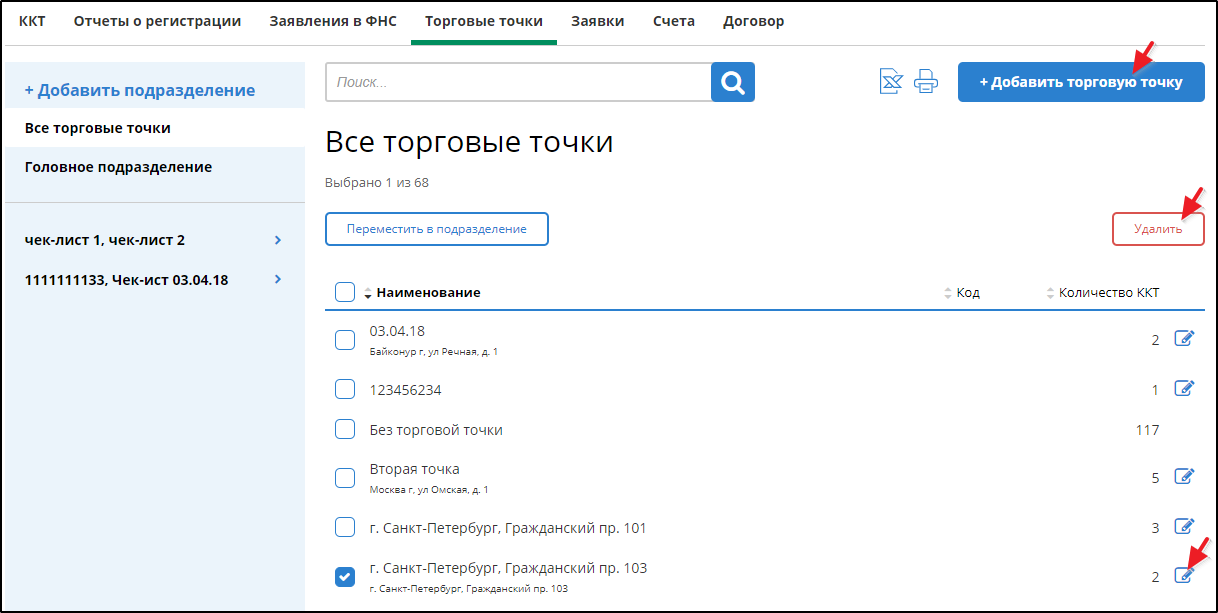 Количество ККТ, прикрепленных к торговой точке, отображается в соответствующем столбце.